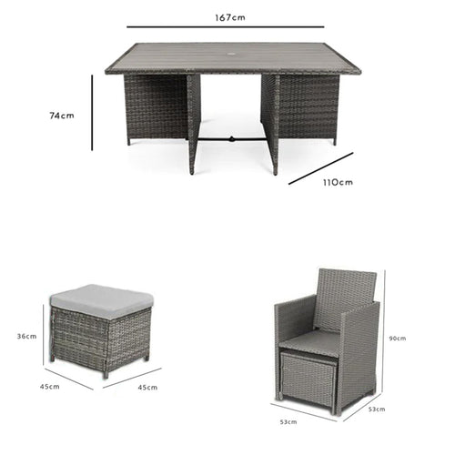 - What's included - 1 x polywood-topped square dining table, 6 x rattan cube dining chairs & 4 x rattan cube footstools in grey rattan. Complete with cream LED premium parasol, parasol base & parasol rain cover.