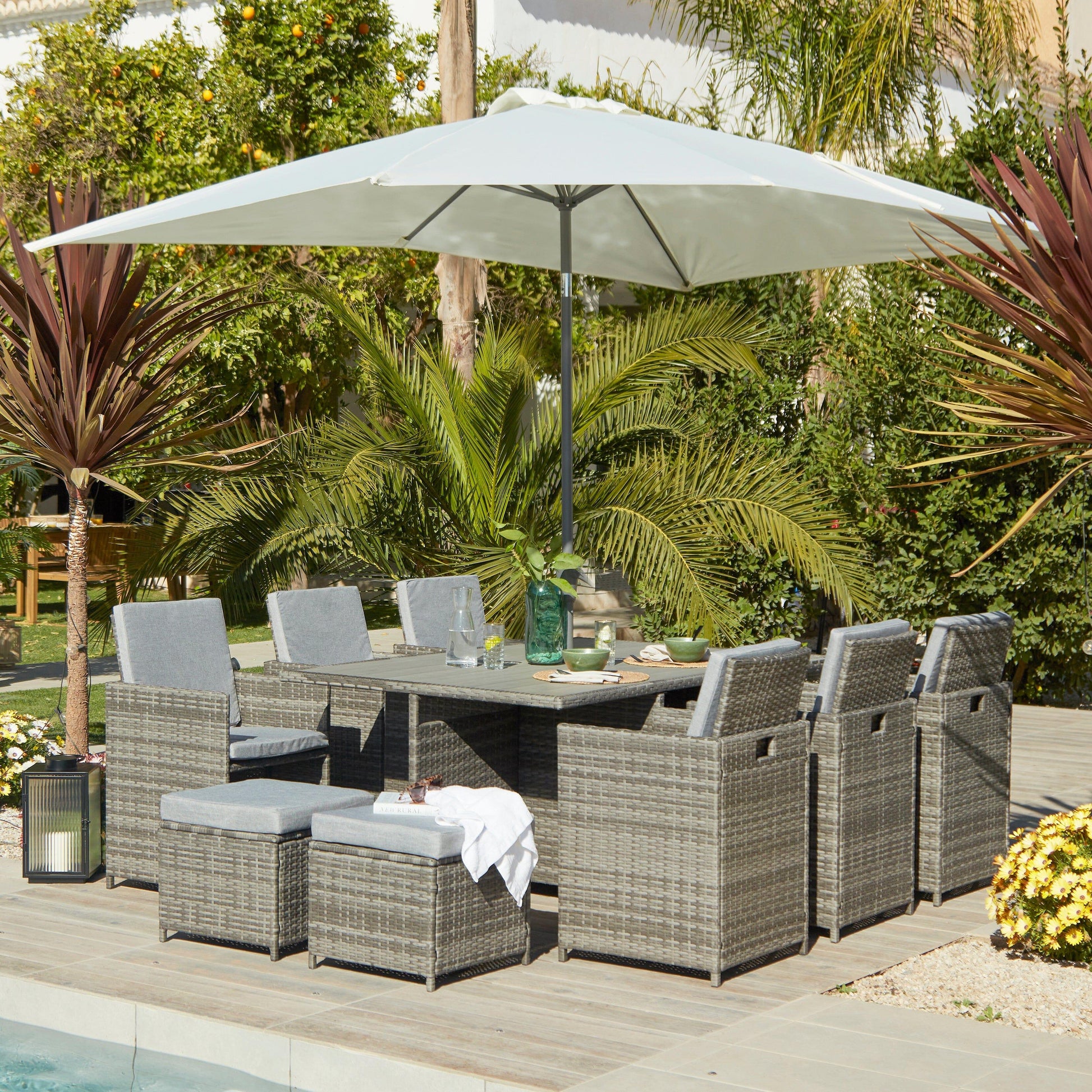10 Seater Rattan Cube Outdoor Dining Set with Cream Parasol - Grey Weave Polywood Top - Laura James