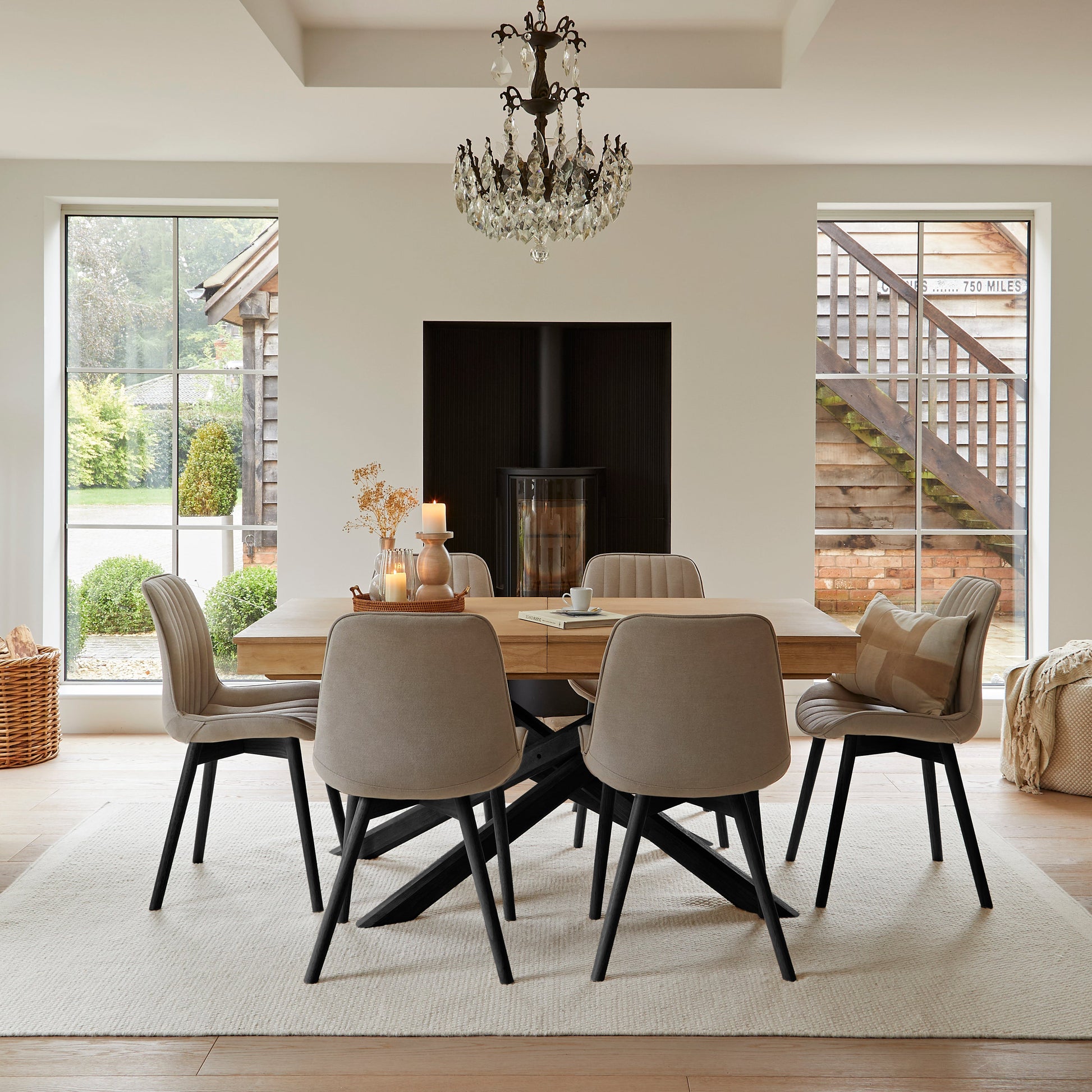 This 6-seater dining set showcases the Amelia whitewash tabletop paired with a black, cross-legged design, creating a striking and unique centrepiece for your dining room. The set includes six Bella soft beige dining chairs, offering a modern, sophisticated, and comfortable dining experience with every meal.
