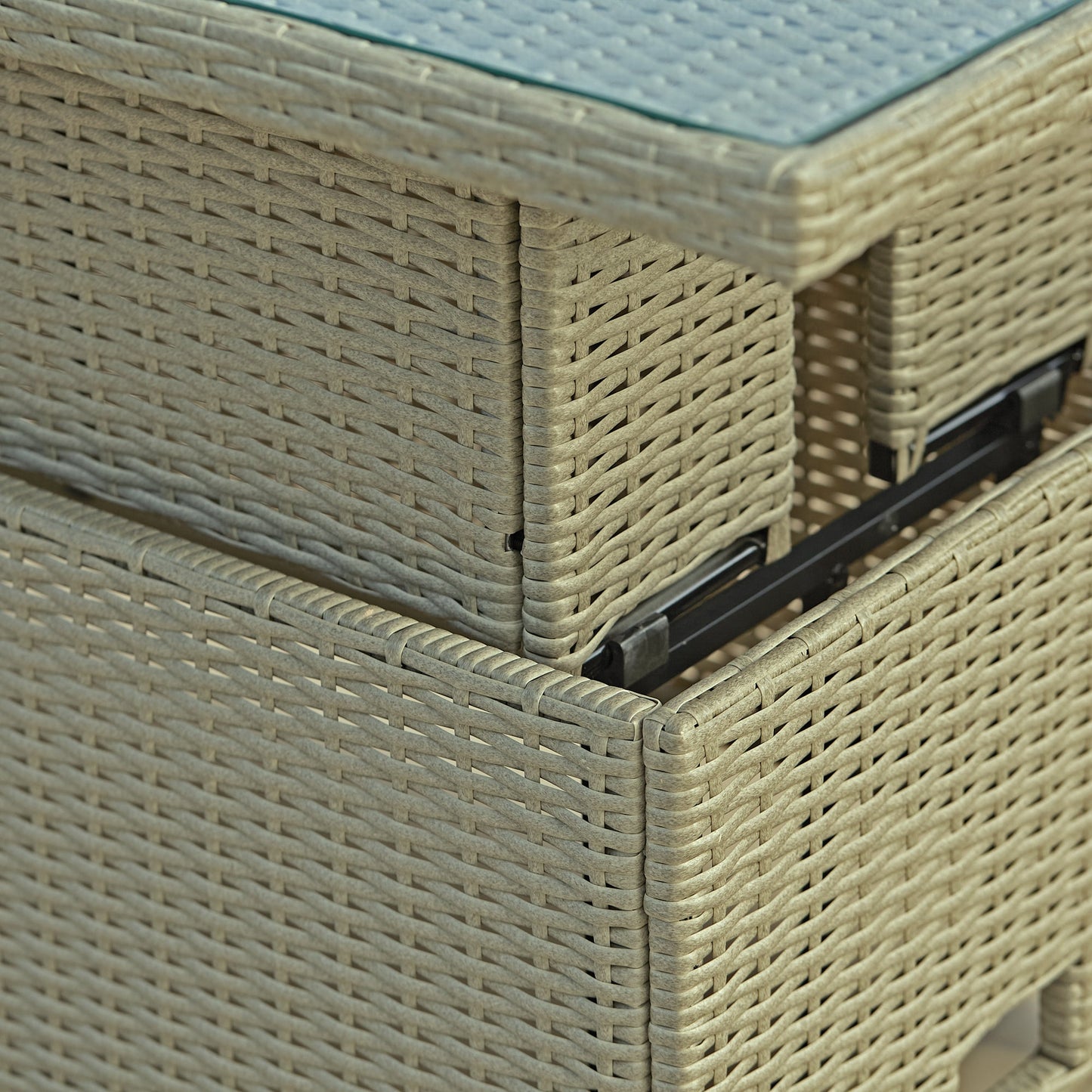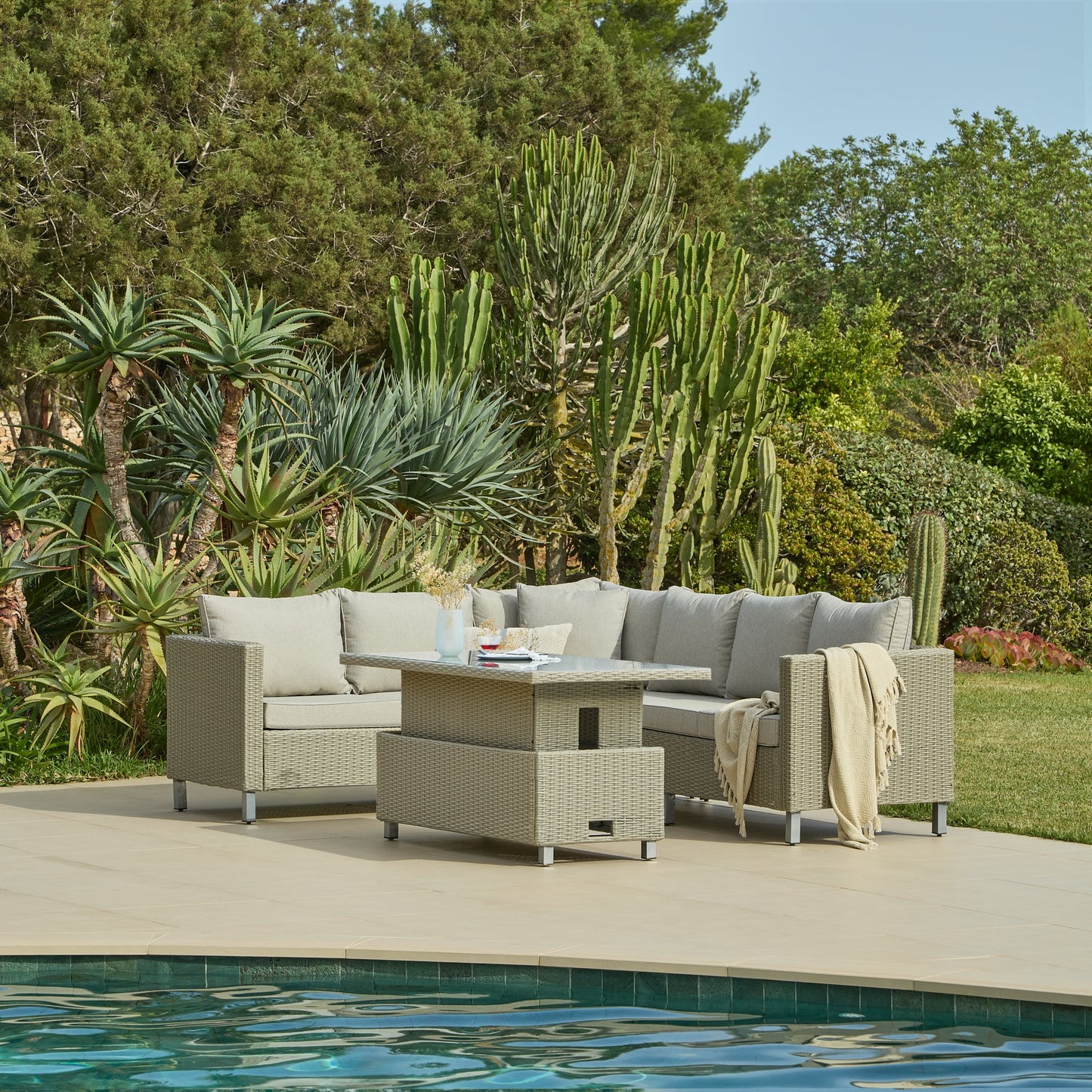 Elevate your outside entertaining space with the light grey Aria corner sofa and coffee  table set. New for 2025 this Aria set features a comfortable sofa with plump seat cushions and a rising table, allowing you to adapt the table for all of your dining and entertaining needs. Designed from premium weather-resistant rattan, this set is ideal for evening cocktails to summer barbeques.