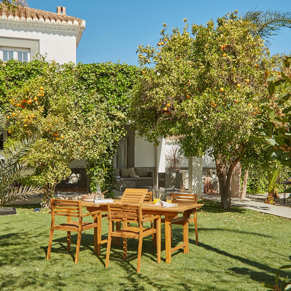 Create a stylish dining experience for family and friends with the Aspen extendable dining table and chairs set. A classic wooden rectangular dining table, Aspen adds a chic touch to any garden space and is perfect for outdoor meals and drinks during the summer months.