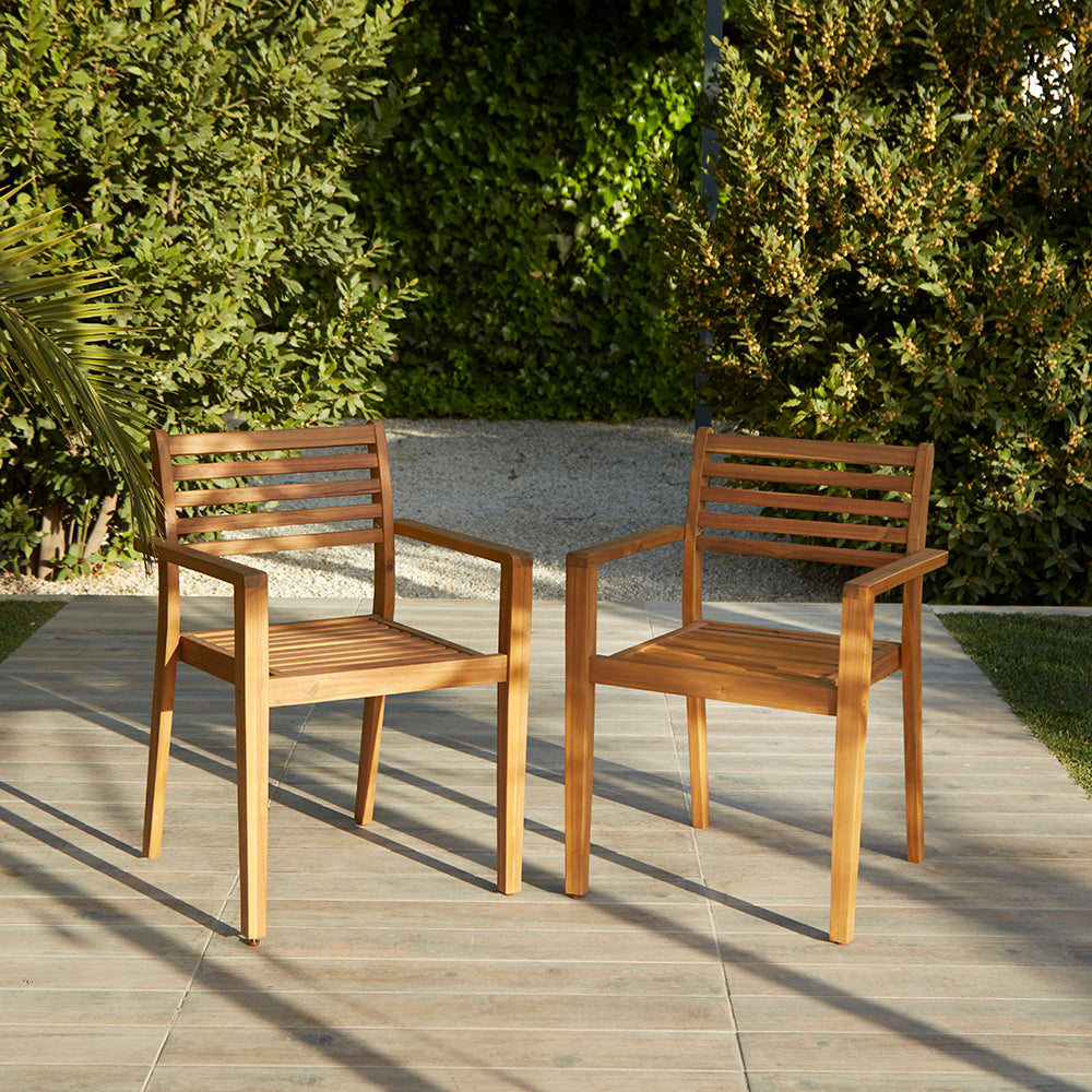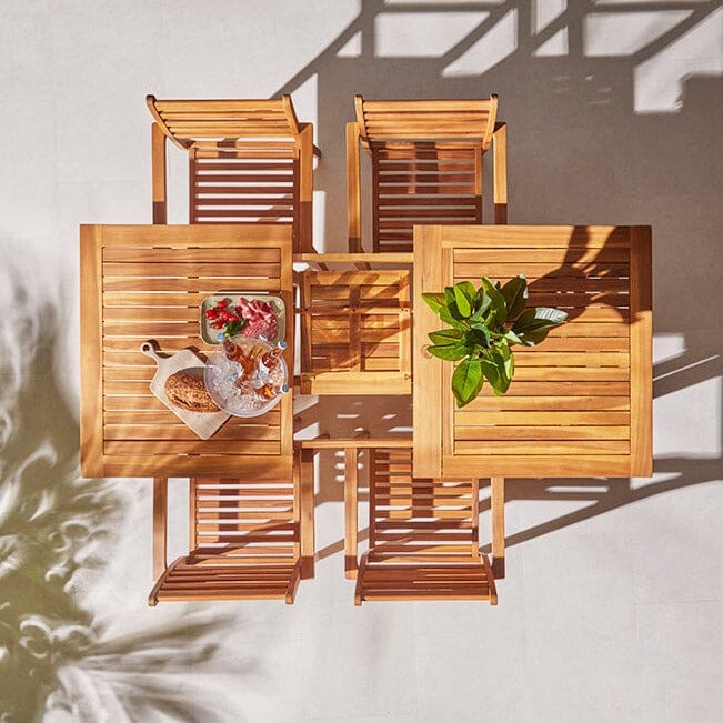 The Aspen dining table and chairs are crafted from solid acacia wood, known for its durability, and it lends a lovely warm wooden tone to the design. This set does not include a parasol; however, you can purchase this separately.