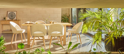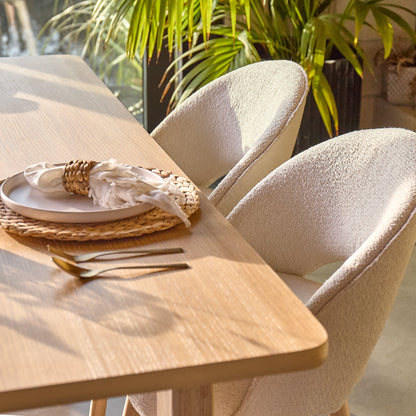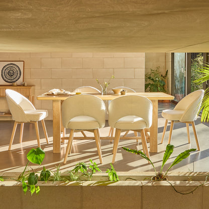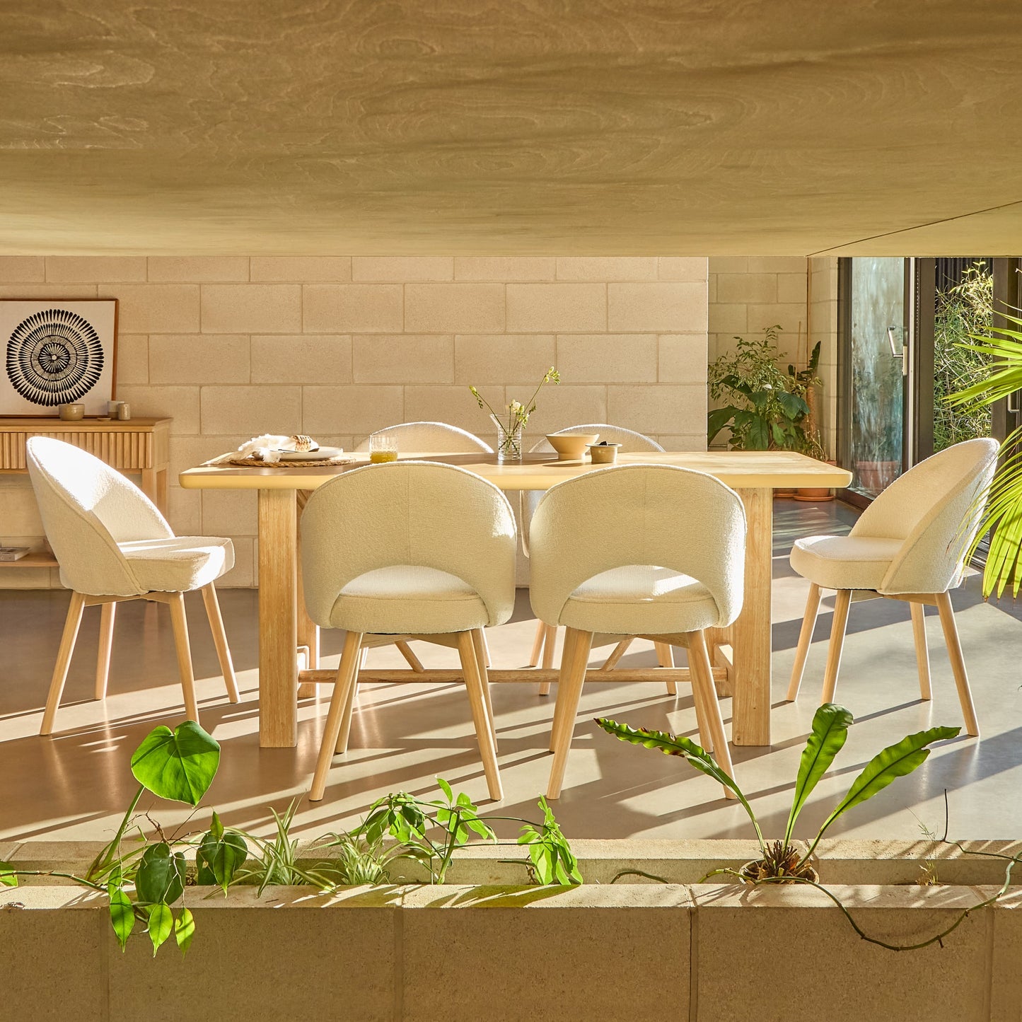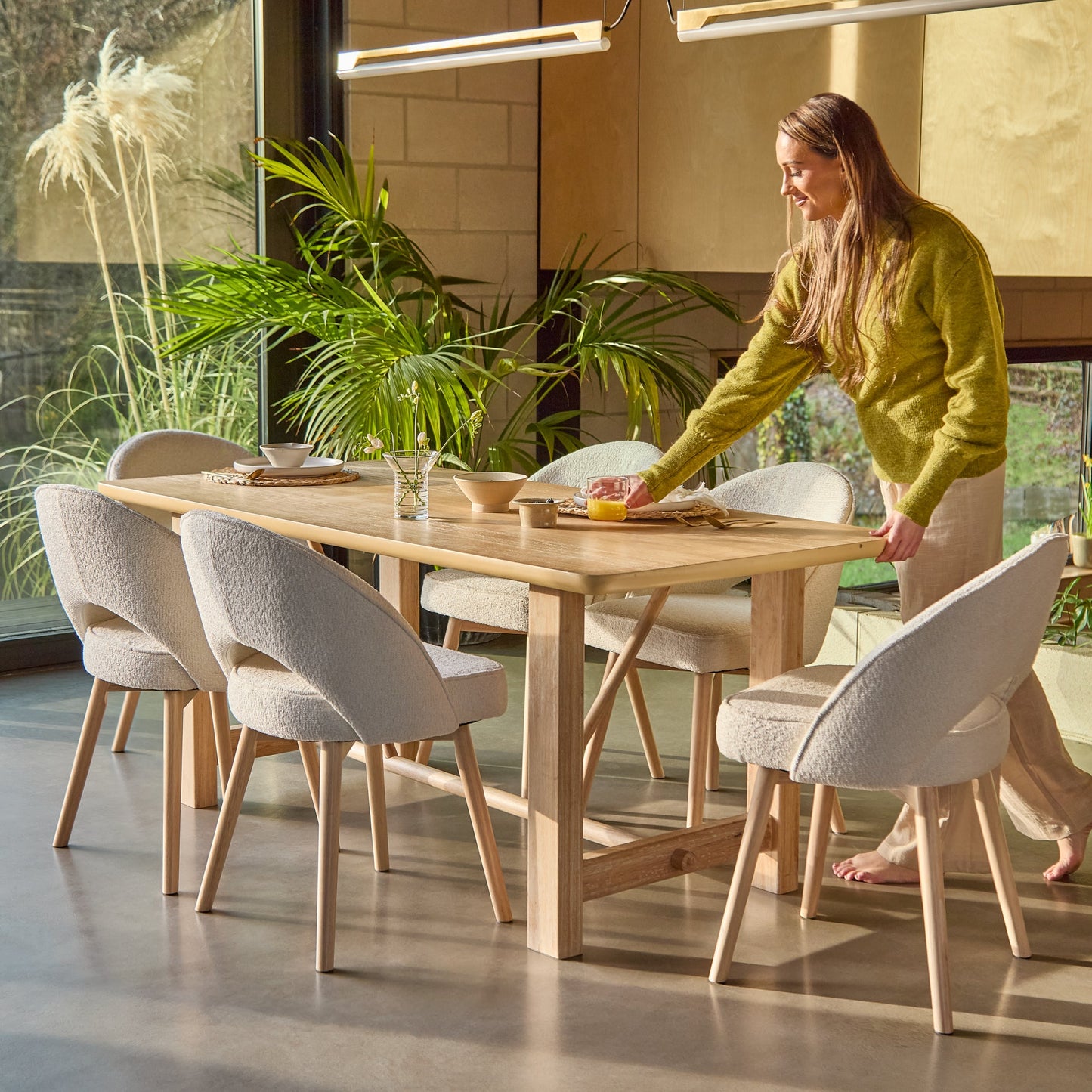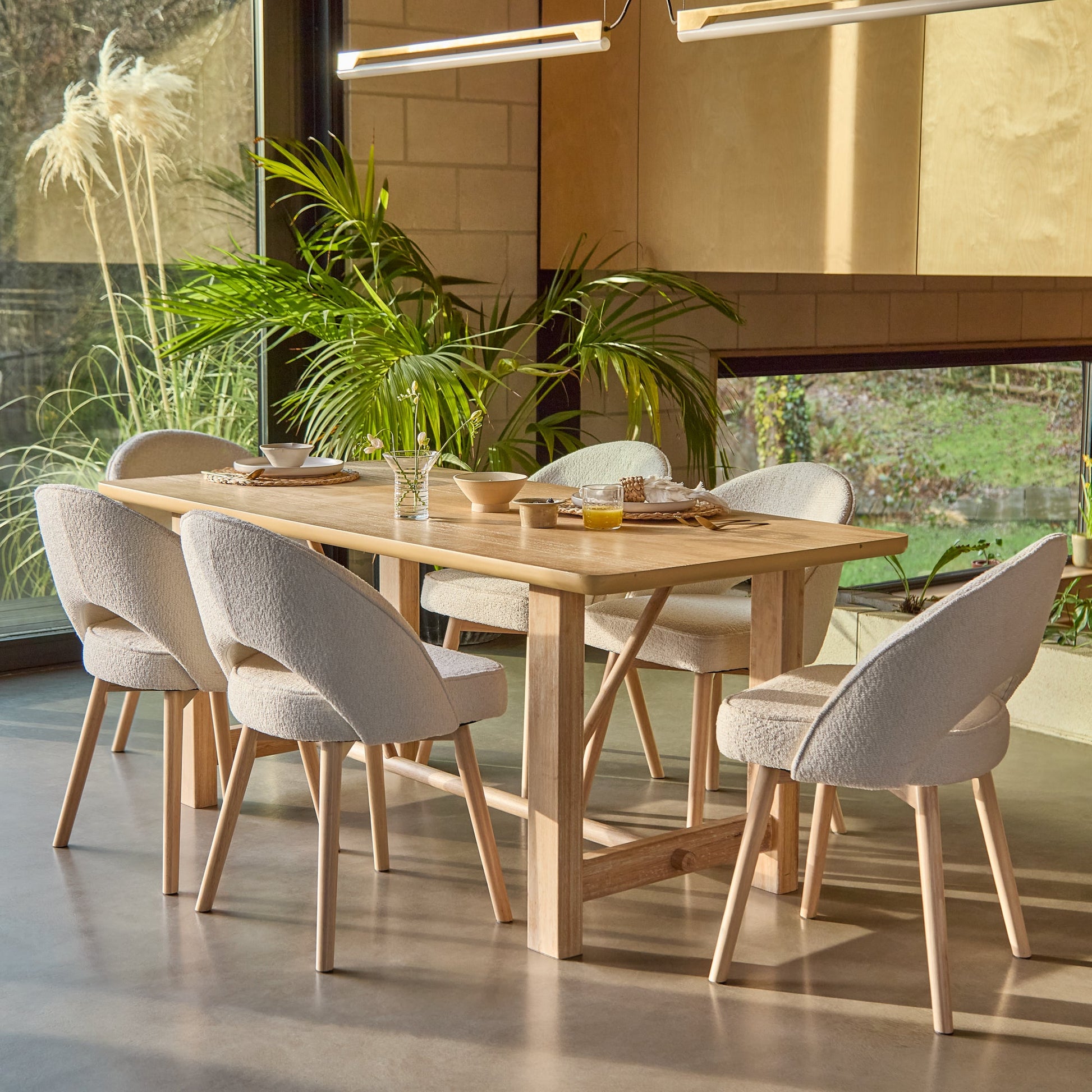 Elevate your dining area with the Carter and Marylin 6 seater dining set. The Carter rectangular table features an MDF and oak veneer tabletop in a whitewash finish, supported by rubberwood spindle style legs for a Scandinavian inspired look. Paired with it are six Marylin dining chairs, each featuring a sleek cut-out design and upholstered in ecru boucle for a soft, textured touch.