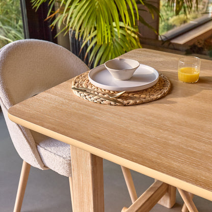 Designed for modern everyday living this large dining set combines whitewash wood tones with neutral textures to create a Scandi-inspired dining room.