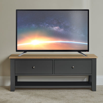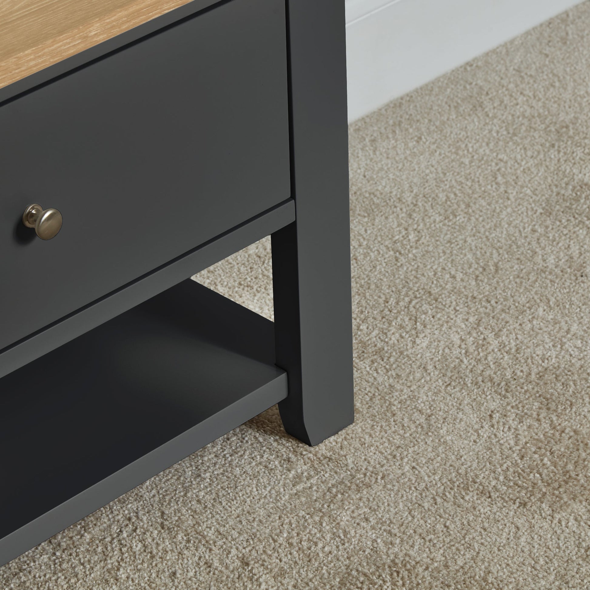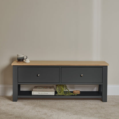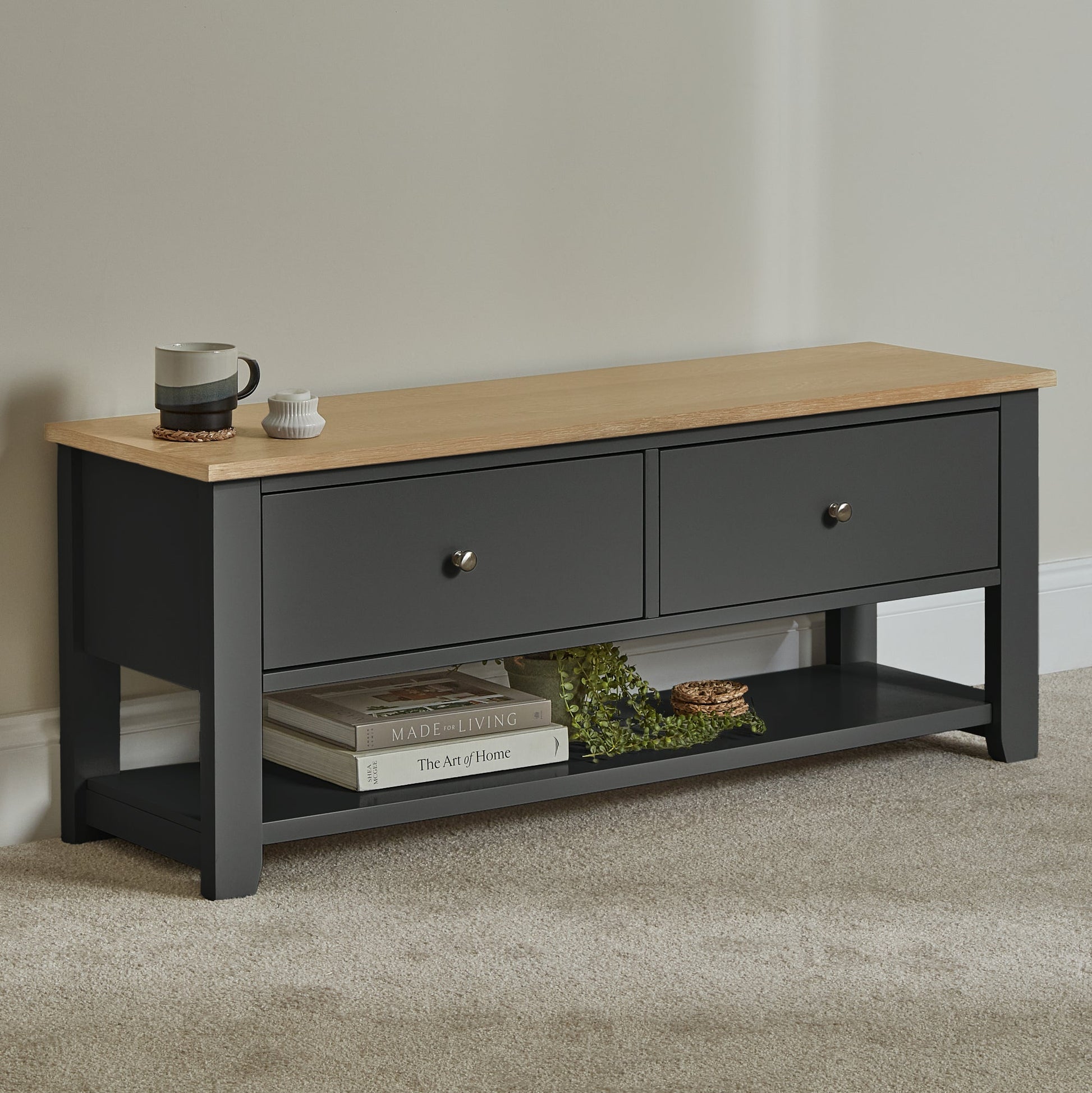 The Chatsworth TV bench is finished in slate grey colourway and features a whitewash oak veneer top. With 2 handy drawers with chrome pull handles this TV bench also features a shelf underneath for storing media boxes or games consoles.