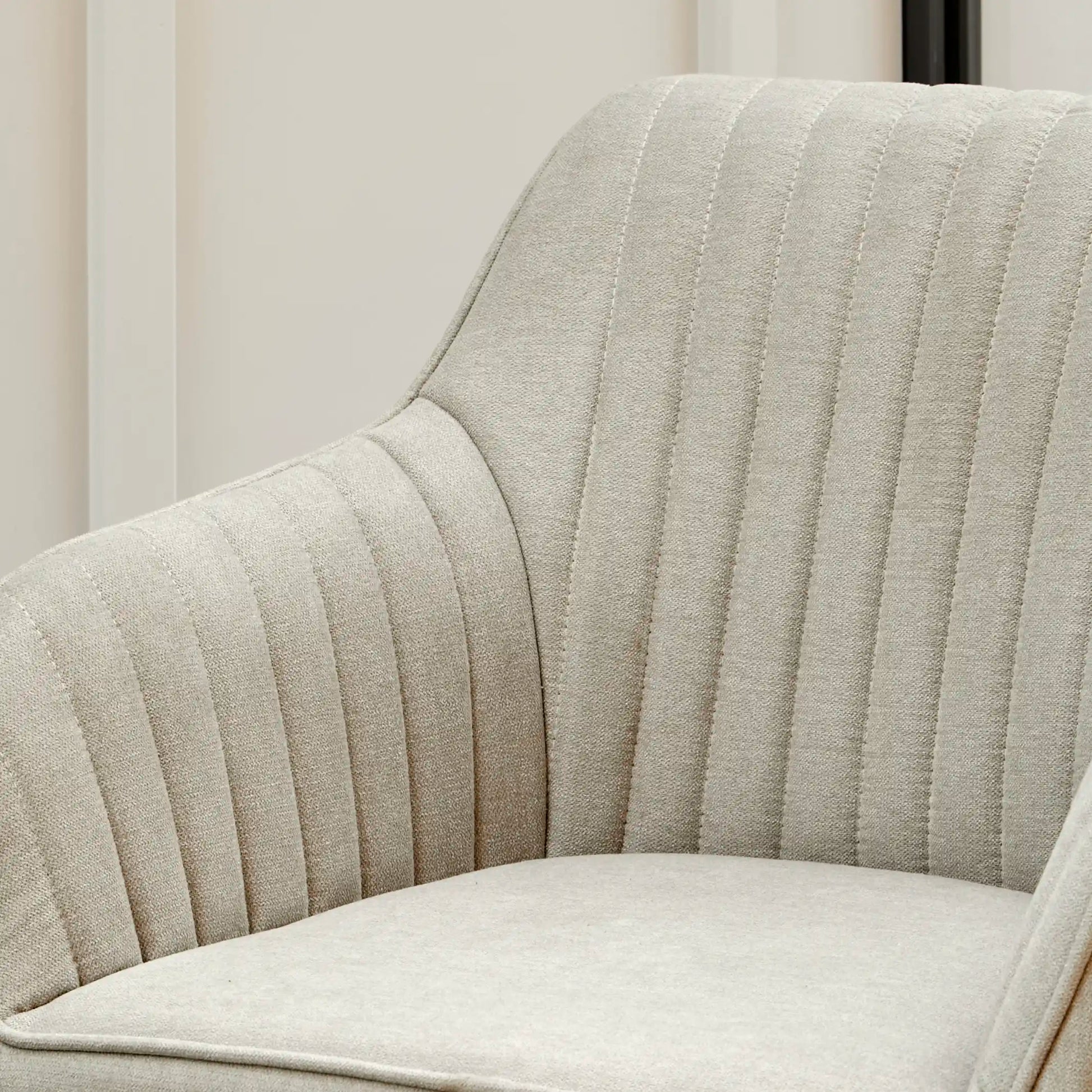 The Darcy beige swivel chair will make a stylish addition to your desk or work from home space. Finished in a soft touch neutral fabric with fluted back, this elegant chair features a 360-degree swivel function. Complete with a padded backrest and comfy arms, The Darcy beige office chair is finished with gold legs making it a chic addition to your home.