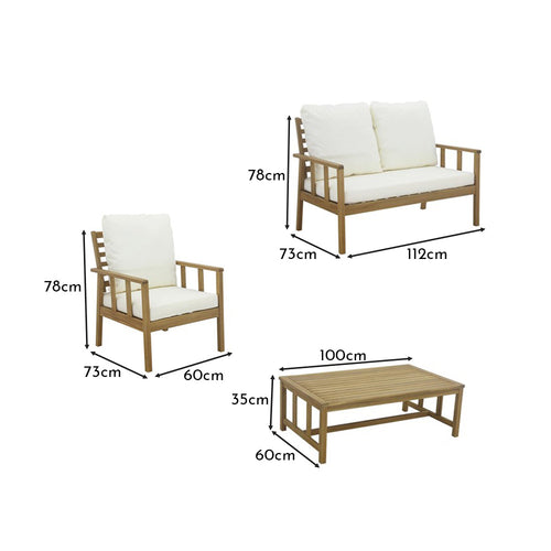 The Harrelson 4-seater wooden garden sofa set features a 2-seater wooden garden sofa, two garden armchairs, and a coffee table, made from solid acacia wood and accompanied by plush grey cushions. This outdoor conversation set is complete with cream premium cantilever parasol and offers a perfect place for relaxation and leisure.