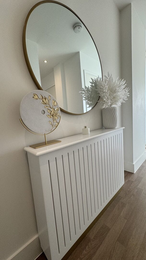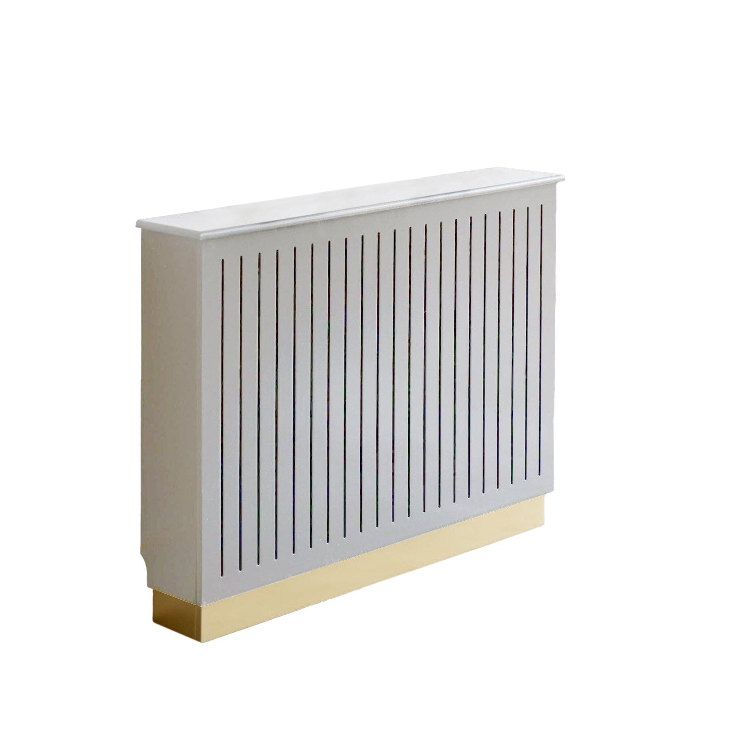Introducing the Laura James Iliana Medium Radiator cover in Snow White, a fresh colour option for 2024. Conceal the utilitarian appearance of your radiator with this elegant white and gold cover, seamlessly integrating it with your surrounding decor while offering an additional shelf or display area for decorative items, plants, or personal belongings.