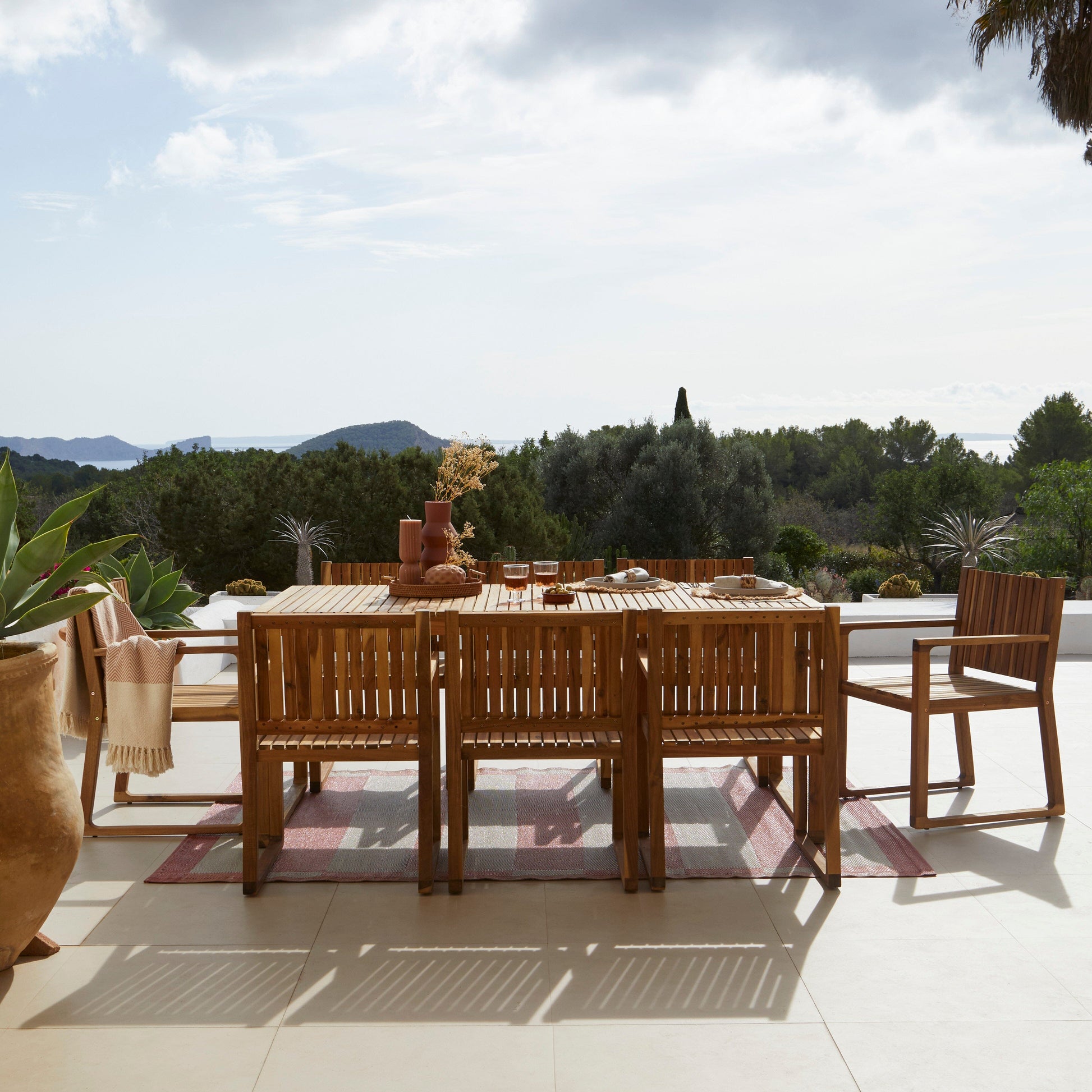 This 8-seater garden dining set features the Lennox rectangular garden table and 8 Lennox garden armchairs, all crafted from acacia wood. This large outdoor set creates the perfect setting for family and friends to join together to enjoy outdoor meals.