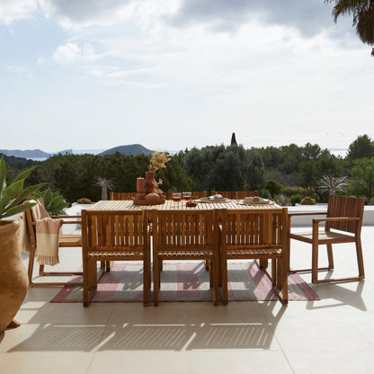 Crafted from warm, orange-toned wood, this dining set offers an inviting feel symbolising sunshine and joyful moments to be shared with family and friends.