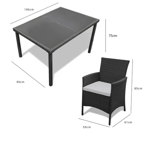 Designed for enduring strength, this dining set embraces PE rattan - a robust material built to endure various elements while retaining its enduring charm. The polywood tabletop infuses a hint of elegance, seamlessly merging style with functionality. Luxurious cushions offer chic comfort, enticing guests to relax during meals, while the poly concrete parasol base guarantees steadfast stability, elegantly supporting the parasol with both grace and practicality. Teamed with sophisticated black rattan armchairs, this set epitomises a blend of sophistication and durability, perfect for your outdoor gatherings.