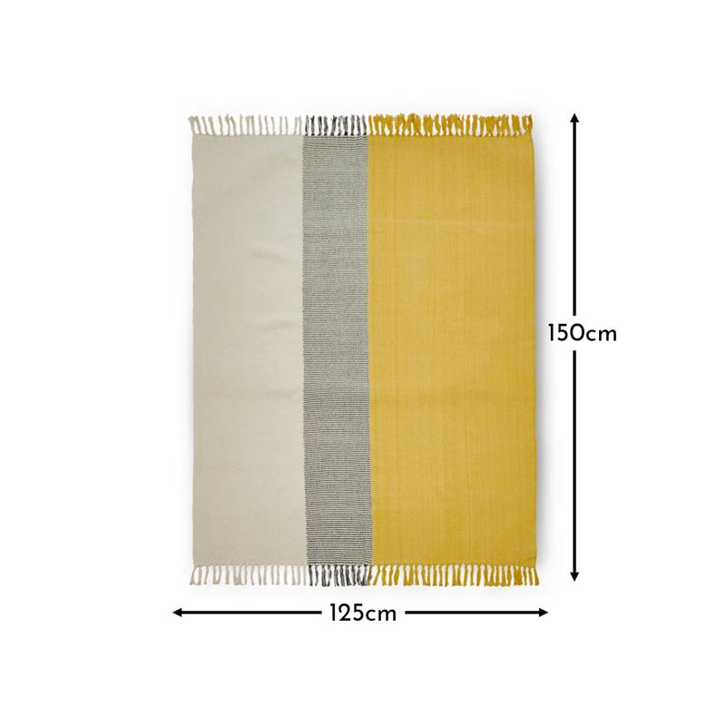 Bring a burst of vibrant colour to your space with the Selu amber yellow reversible throw. Made from 100% cotton, it showcases a bold striped design in amber yellow, black, and clay for a distinctive look. Perfect for draping over a sofa or bed indoors, or for adding warmth to outdoor settings on cool evenings.